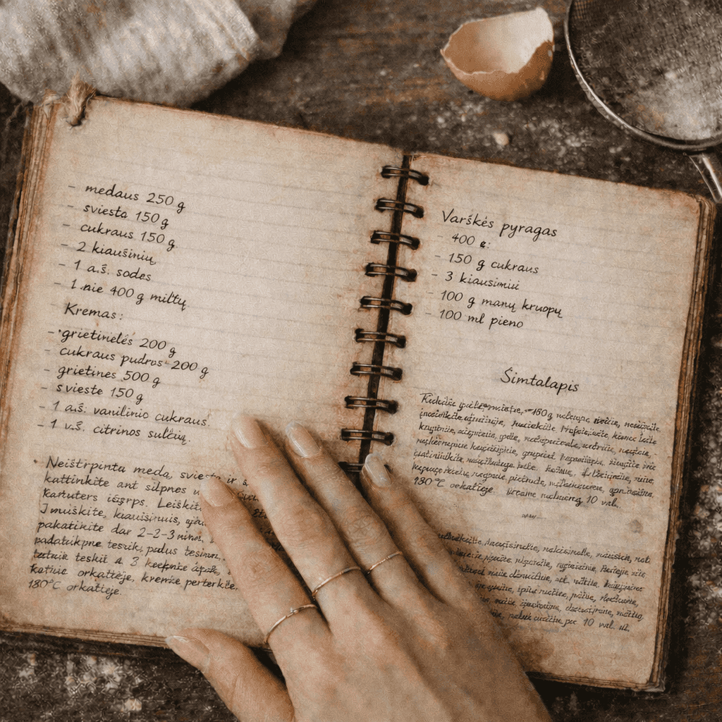 Mūsų kepyklos istorija prasidėjo ne verslo plane, o paprastoje, jaukioje namų virtuvėje. Aš užaugau stebėdama savo močiutę, kaip ji maišo, kočioja ir kepa. Tie pirmieji kepimo bandymai buvo geriausia mano dienos dalis, o močiutės kruopščiai užrašyti receptai man visada buvo tikras lobis.